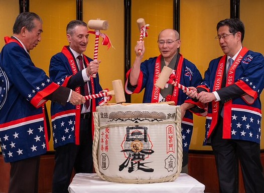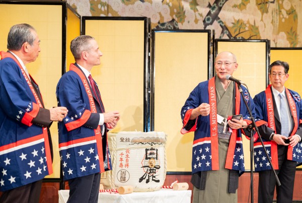 The traditional kagami-biraki ceremony was conducted by four distinguished guests: President Kanoh, Consul General Larsen, Mr. Yasushi Misawa, Representative of the Government of Japan / Ambassador in charge of Kansai, and First Vice President Mr. Nishio. Ambassador Misawa then led the toast.